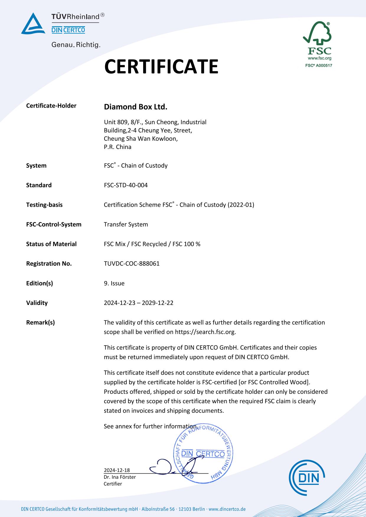 Being FSC® COC certified shows that we comply with the highest social and environmental standards on the market. One can easily search by the certification number TUVDC-COC-888061 for reference.