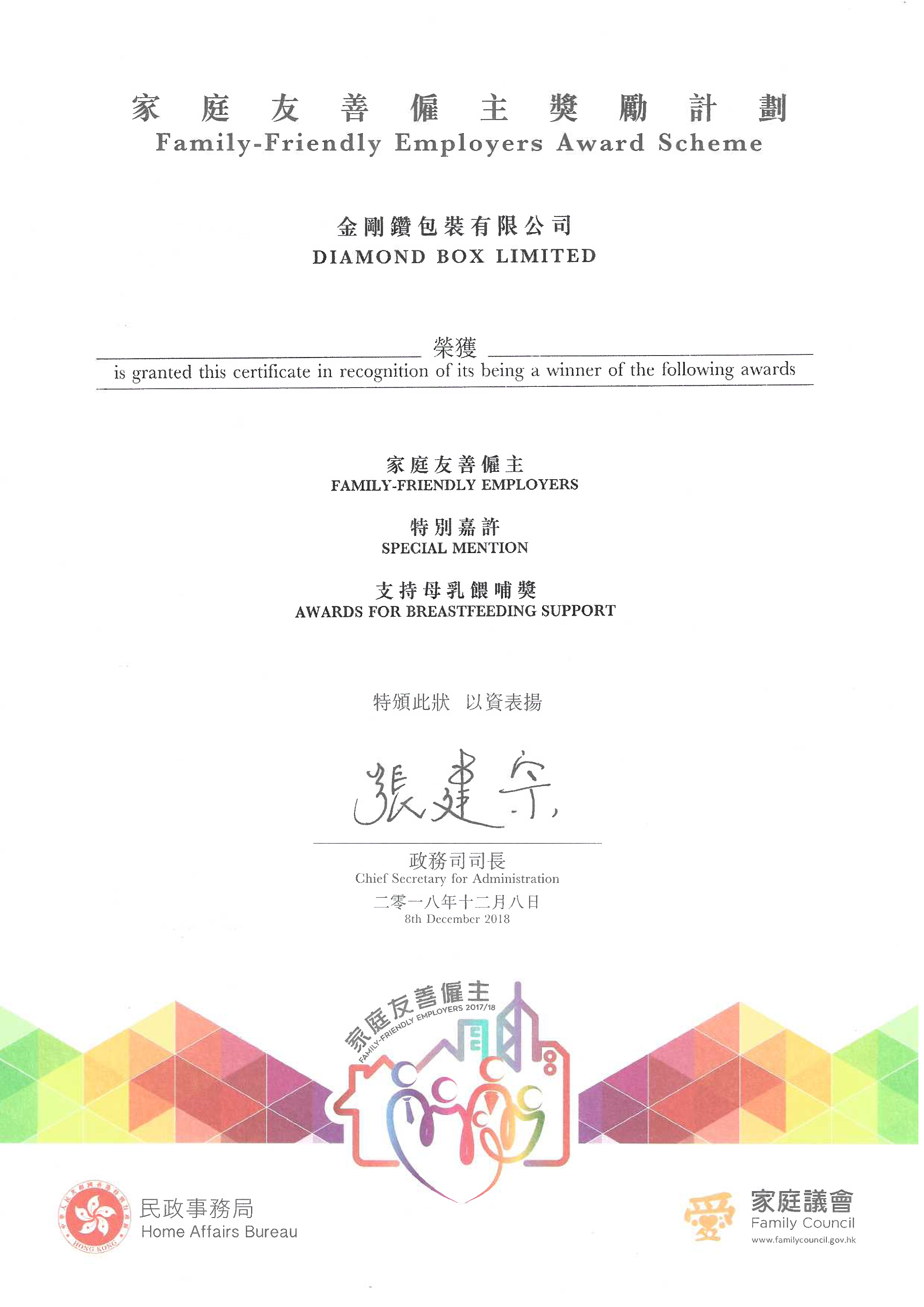 Diamond Box Ltd. takes pride to be awarded the certificate of 2015/16 & 2017/18 Family-Friendly Employers Award Scheme.