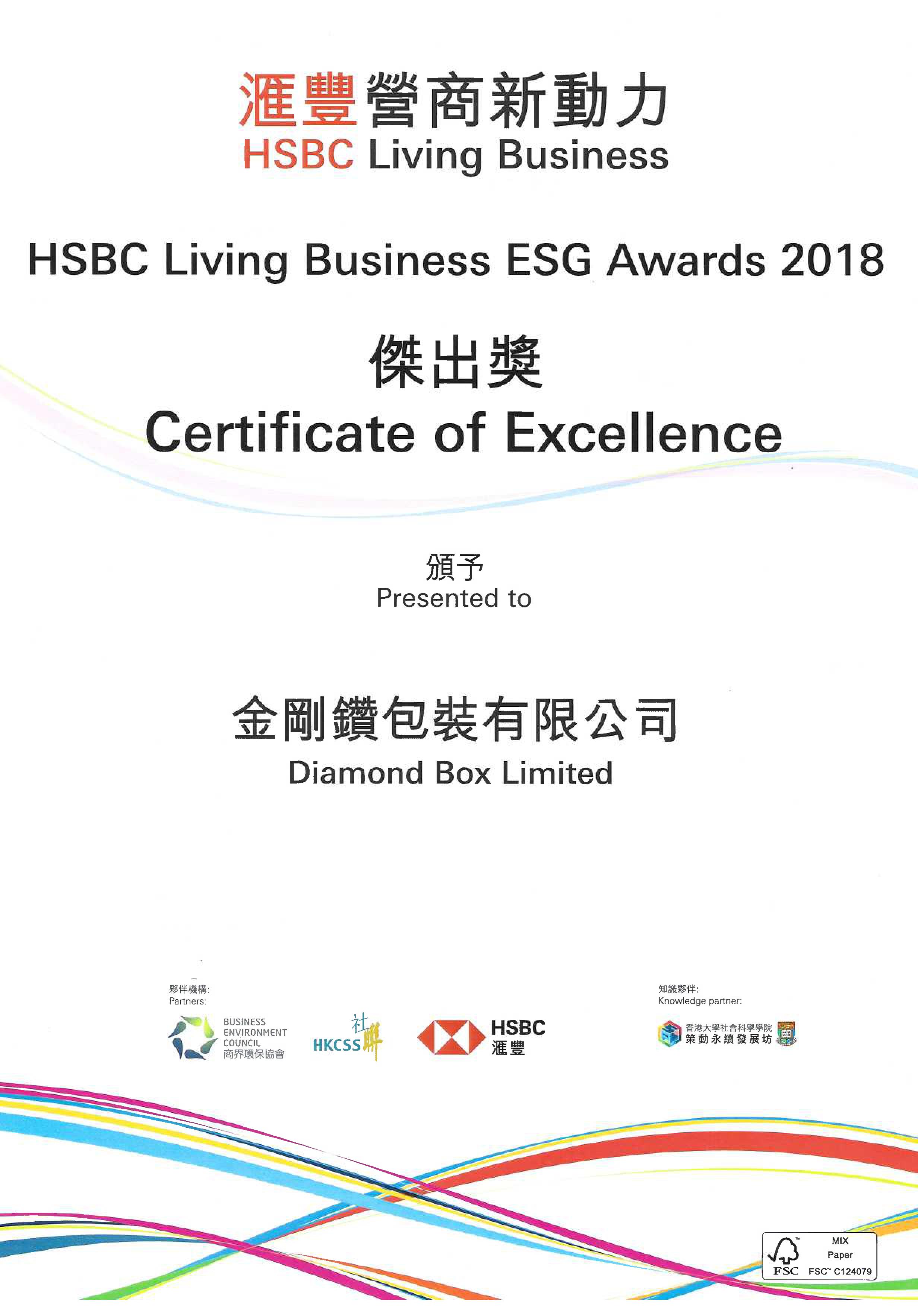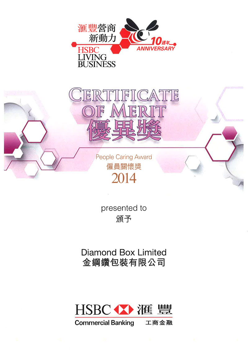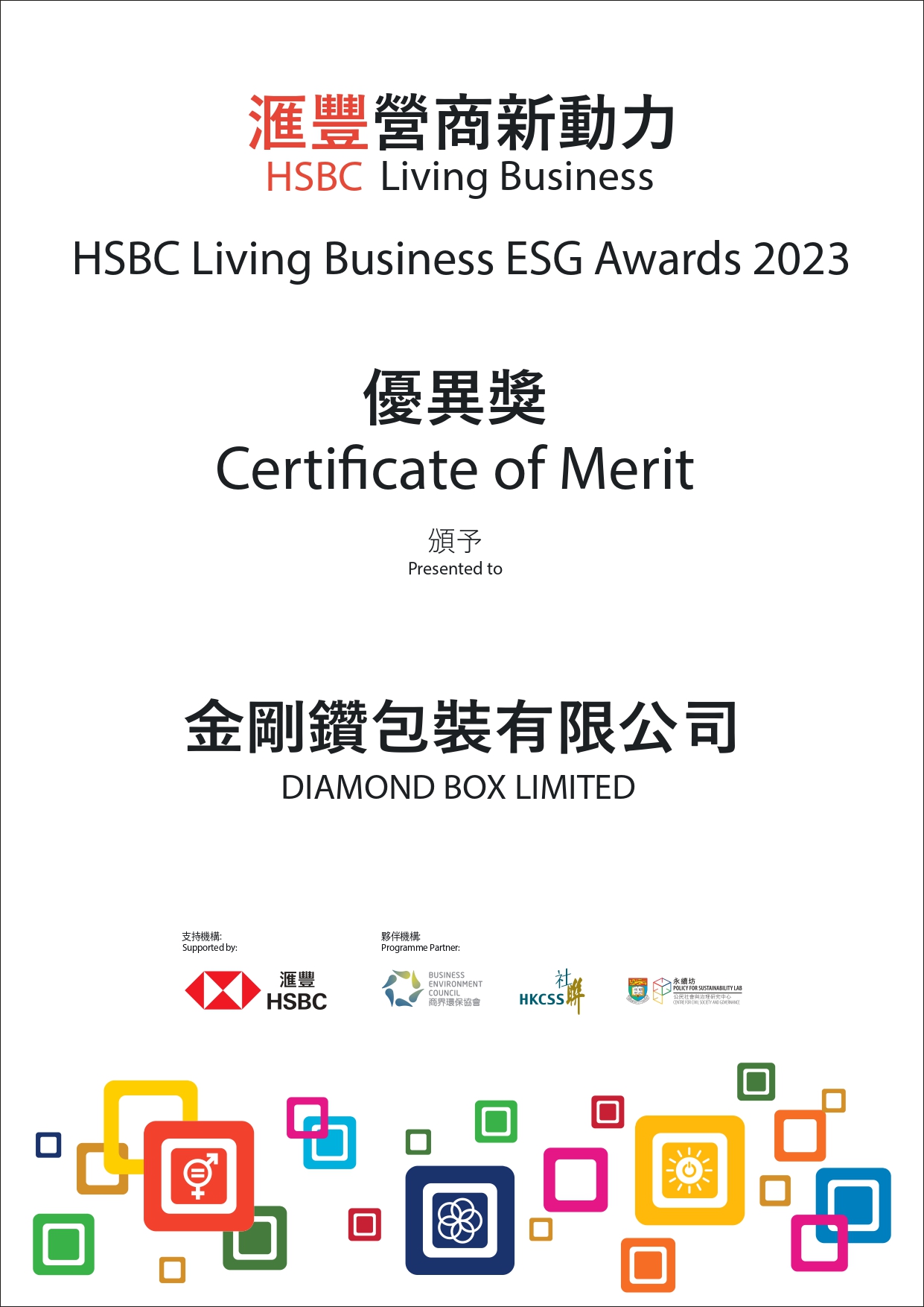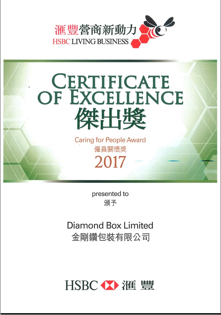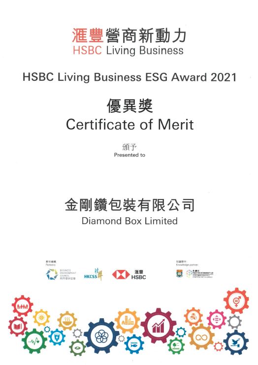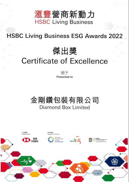 Diamond Box Ltd. takes pride to be awarded the People Caring Award in 2014-2017 , the Green Achievement Award in 2016 & the Environment , Social & Governance (ESG) Award in 2018-2019, 2021-2023.